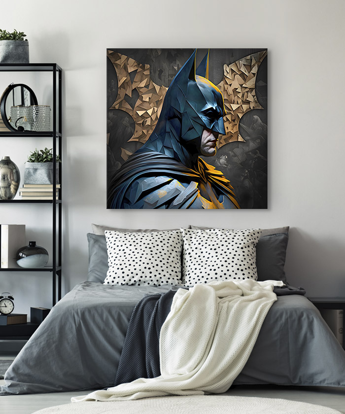 Chez Tableau Déco, nous réalisons tous les visuels de nos tableaux décoratifs. Notre métier, c’est aussi la création artistique. Ainsi, vous ne retrouverez nos tableaux nulle part ailleurs. Nous fabriquons ce tableau déco Batman super héros Dc Comics Polygonal en France, dans notre atelier de région parisienne.