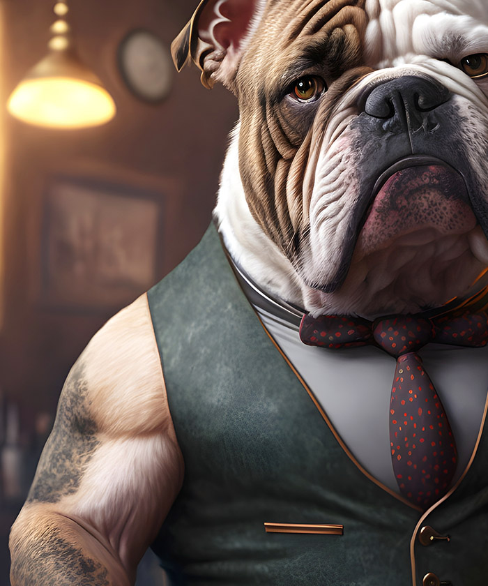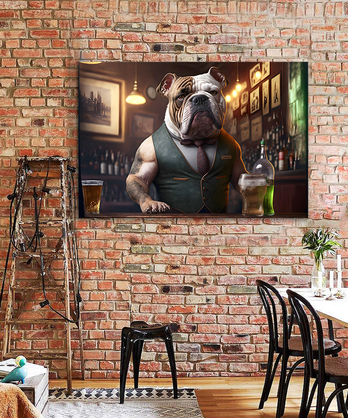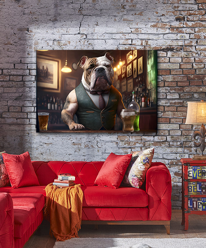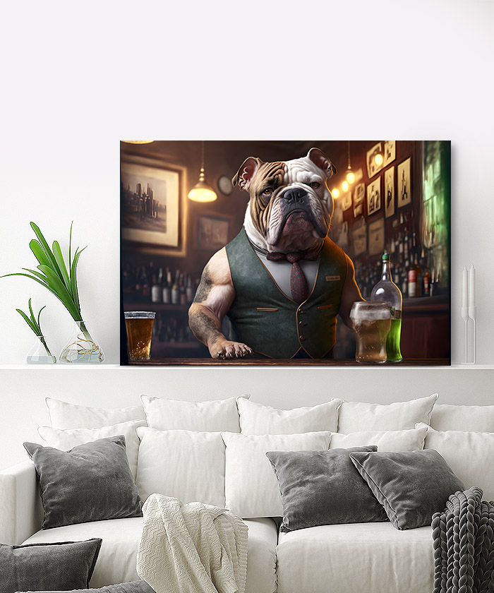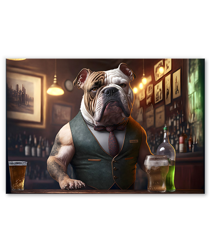 Nous vous présentons le tableau déco Bulldog Barman. Si vous faites partie de ceux qui sont fans de cet animal, vous devriez aimer ce tableau déco de chien autant que nous. En vous proposant ce tableau décoratif, nous souhaitons apporter un zeste d’originalité à votre intérieur. Cette toile propose une touche à la fois campagne et design.