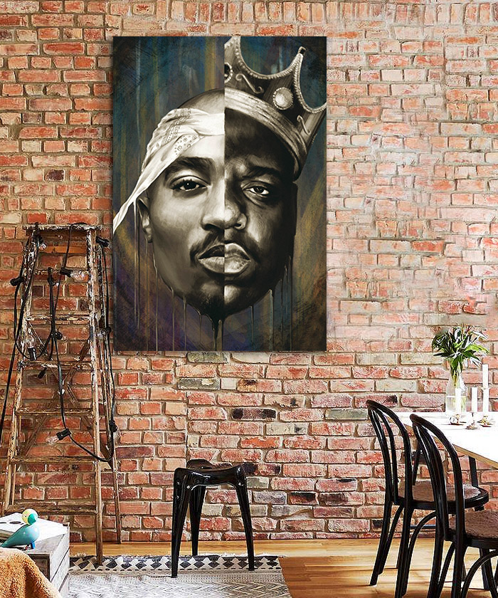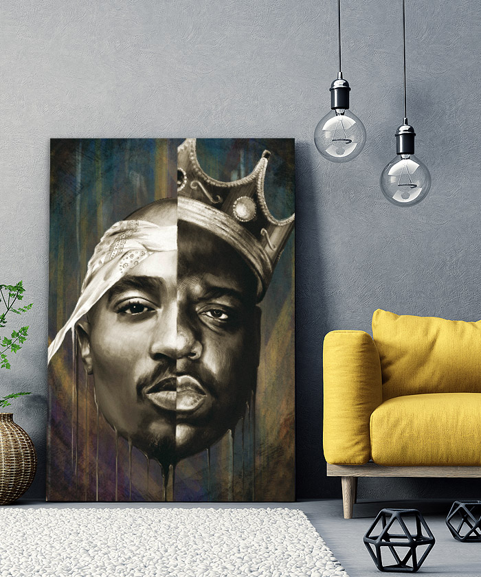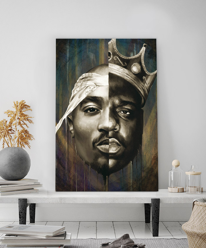 Nous vous présentons le tableau déco Biggie et Tupac Hip Hop Pop Art. Si vous aimez ces deux célébrités, vous devriez aimer ce tableau déco de Biggie et Tupac autant que nous. En vous proposant ce tableau décoratif, nous souhaitons apporter un zeste d’originalité à votre intérieur. Cette toile propose une touche à la fois urbaine et vintage.