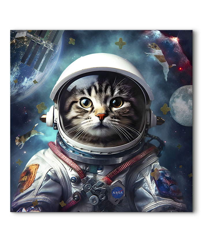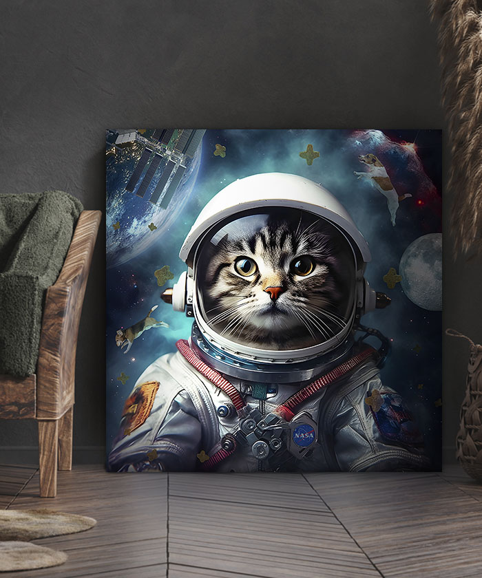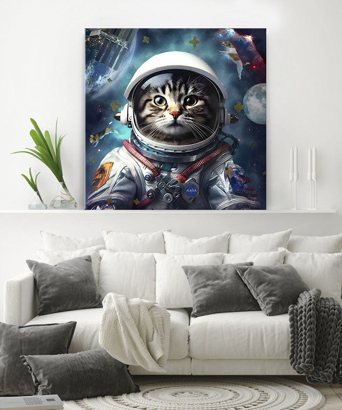 Nous vous présentons le tableau déco Chat Astronaute Cosmonaute. Si vous faites partie de ceux qui sont fans de cet animal, vous devriez aimer ce tableau déco de chat autant que nous. En vous proposant ce tableau décoratif, nous souhaitons apporter un zeste d’originalité à votre intérieur. Cette toile propose une touche à la fois moderne et pop-art.