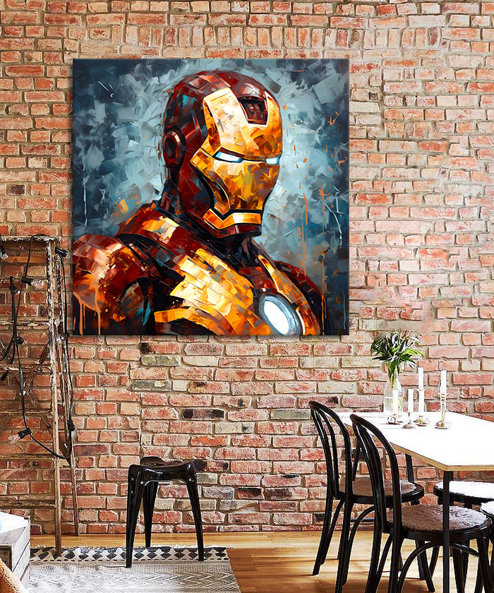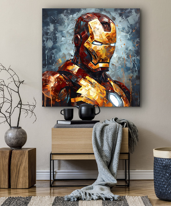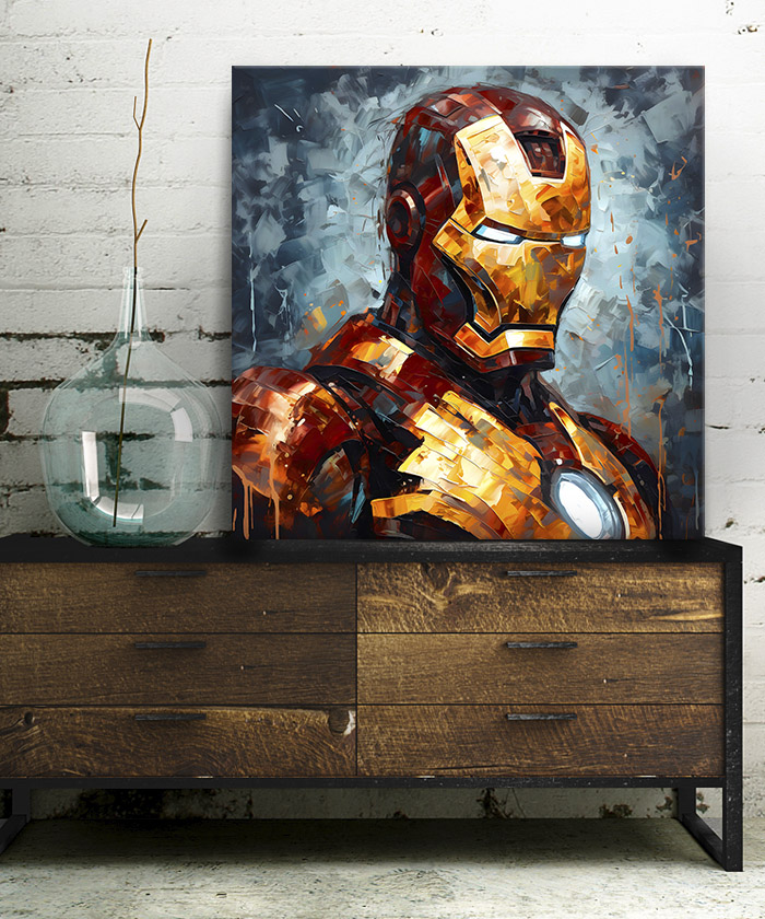 Chez Tableau Déco, nous réalisons tous les visuels de nos tableaux décoratifs. Notre métier, c’est aussi la création artistique. Ainsi, vous ne retrouverez nos tableaux nulle part ailleurs. Nous fabriquons ce tableau déco Iron Man Marvel peinture huile pop art en France, dans notre atelier de région parisienne.