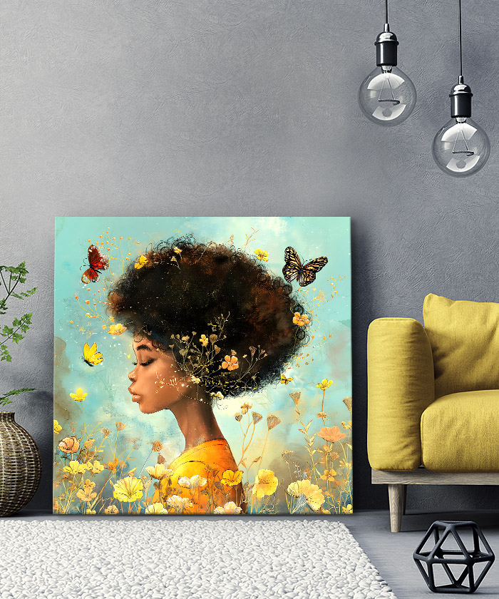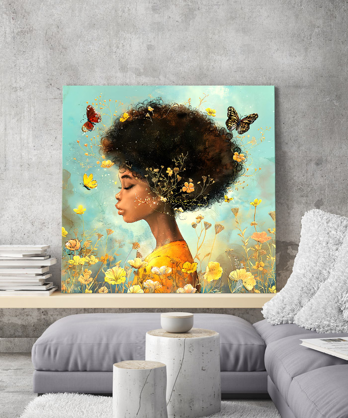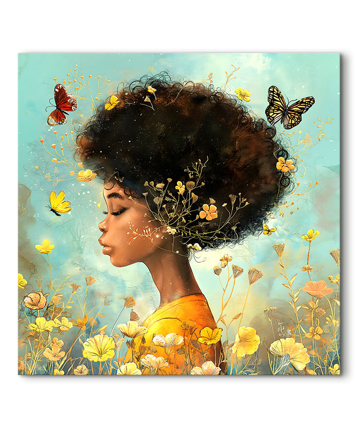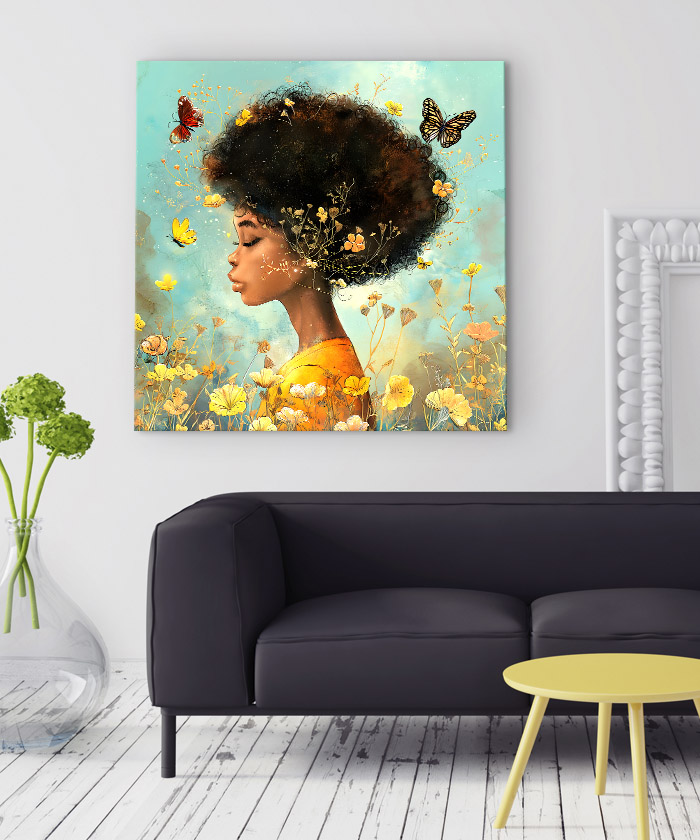 Chez Tableau Déco, nous réalisons tous les visuels de nos tableaux décoratifs. Notre métier, c’est aussi la création artistique. Ainsi, vous ne retrouverez nos tableaux nulle part ailleurs. Nous fabriquons ce tableau déco la fille au milieu des fleurs et des papillons en France, dans notre atelier de région parisienne.