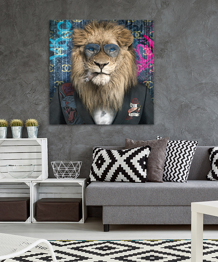 Chez Tableau Déco, nous réalisons tous les visuels de nos tableaux décoratifs. Notre métier, c’est aussi la création artistique. Ainsi, vous ne retrouverez nos tableaux nulle part ailleurs. Nous fabriquons ce tableau déco Mister Lion et son cigare pop art en France, dans notre atelier de région parisienne.