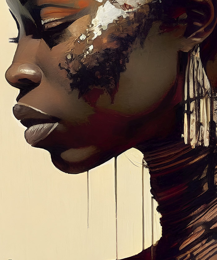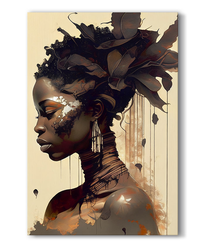 Nous vous présentons le tableau déco portrait femme africaine à chevelure de feuilles. Si vous aimez la peinture, vous devriez aimer ce tableau déco de femme africaine autant que nous. En vous proposant ce tableau décoratif, nous souhaitons apporter un zeste d’originalité à votre intérieur. Cette toile propose une touche à la fois ethnique et contemporain.