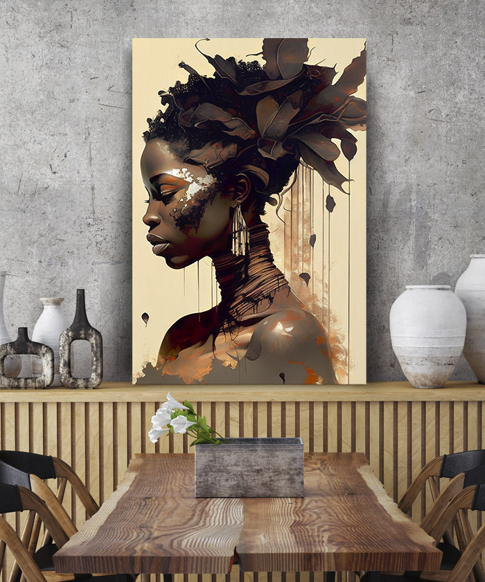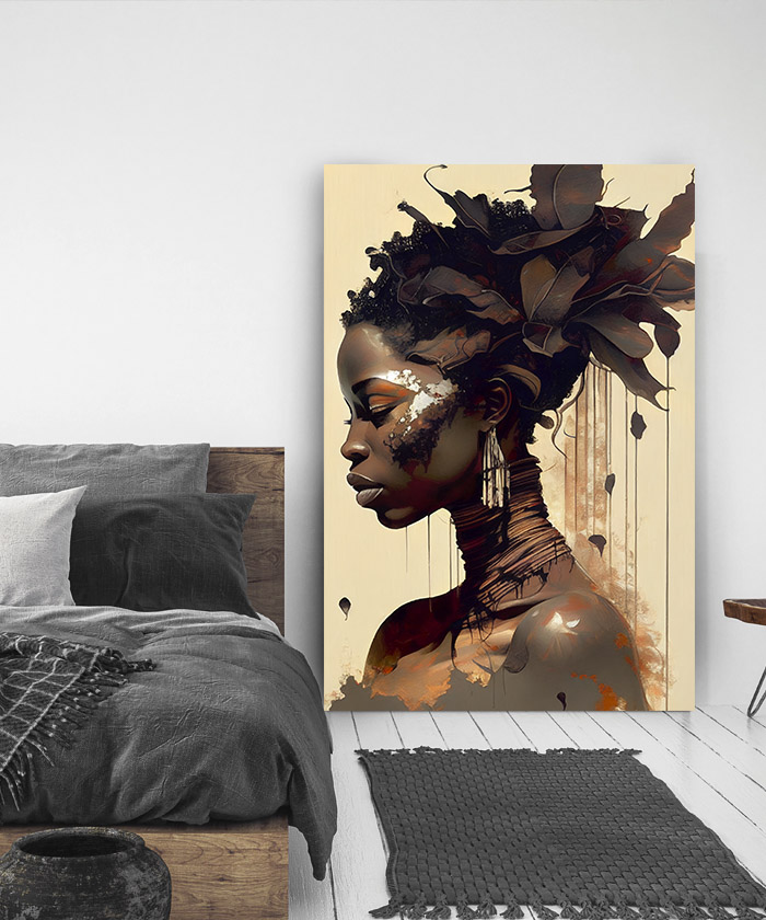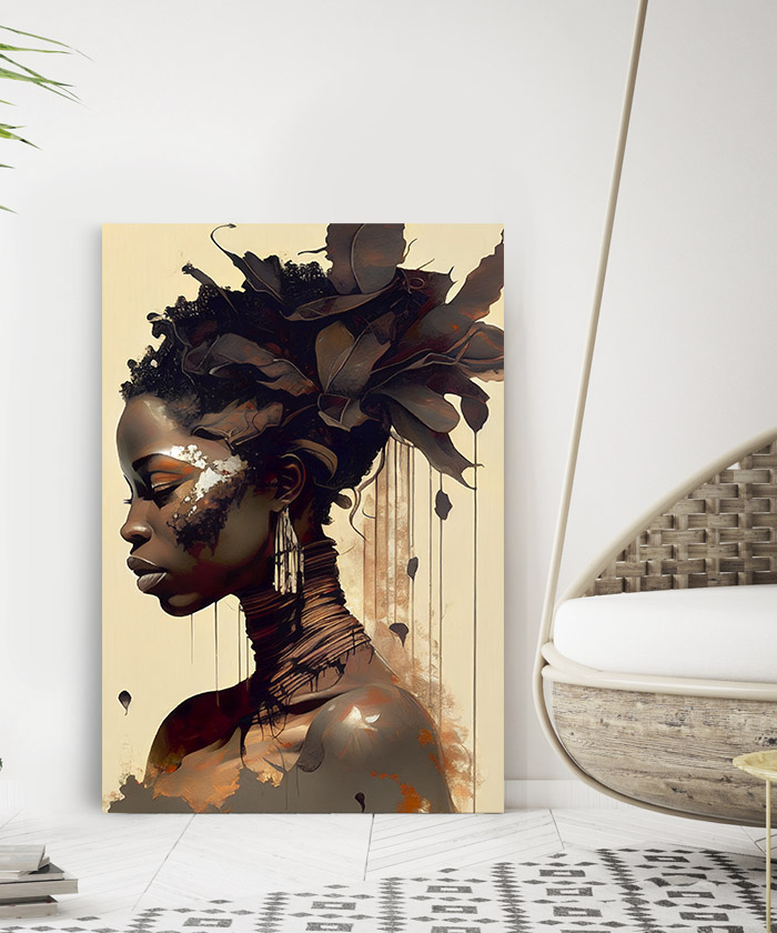 Chez Tableau Déco, nous réalisons tous les visuels de nos tableaux décoratifs. Notre métier, c’est aussi la création artistique. Ainsi, vous ne retrouverez nos tableaux nulle part ailleurs. Nous fabriquons ce tableau déco portrait femme africaine à chevelure de feuilles en France, dans notre atelier de région parisienne.