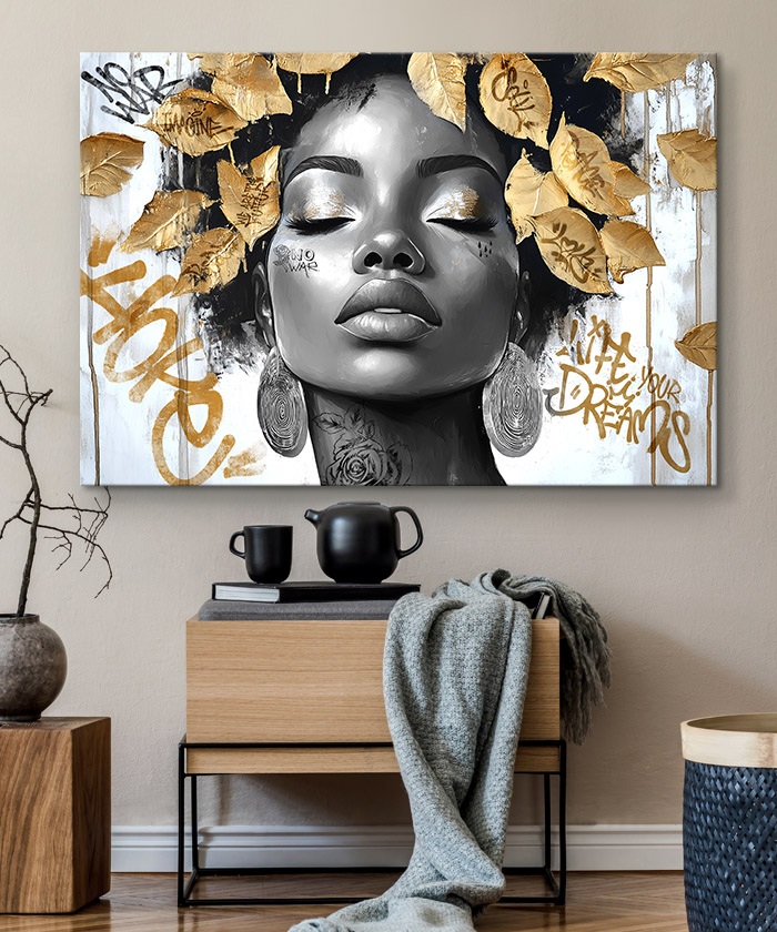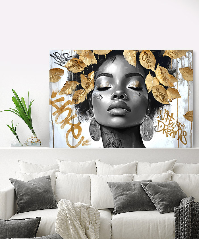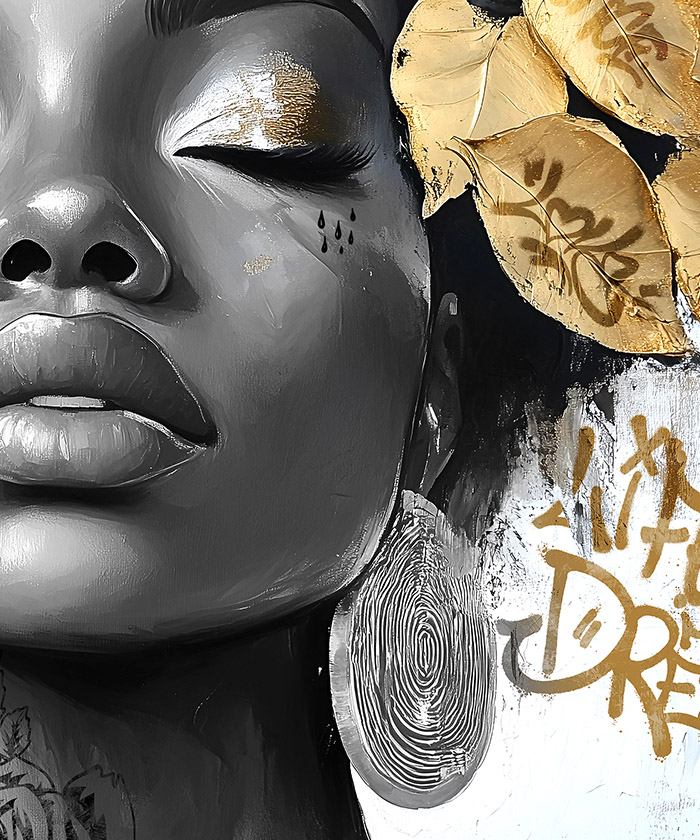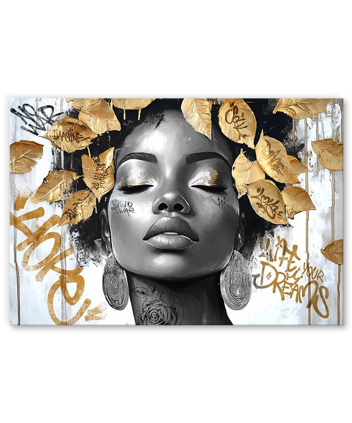 Nous vous présentons le tableau déco portrait femme africaine feuille d’or street art. Si vous aimez la peinture, vous devriez aimer ce tableau déco de femme africaine feuille d’or autant que nous. En vous proposant ce tableau décoratif, nous souhaitons apporter un zeste d’originalité à votre intérieur. Cette toile propose une touche à la fois ethnique et urbaine.