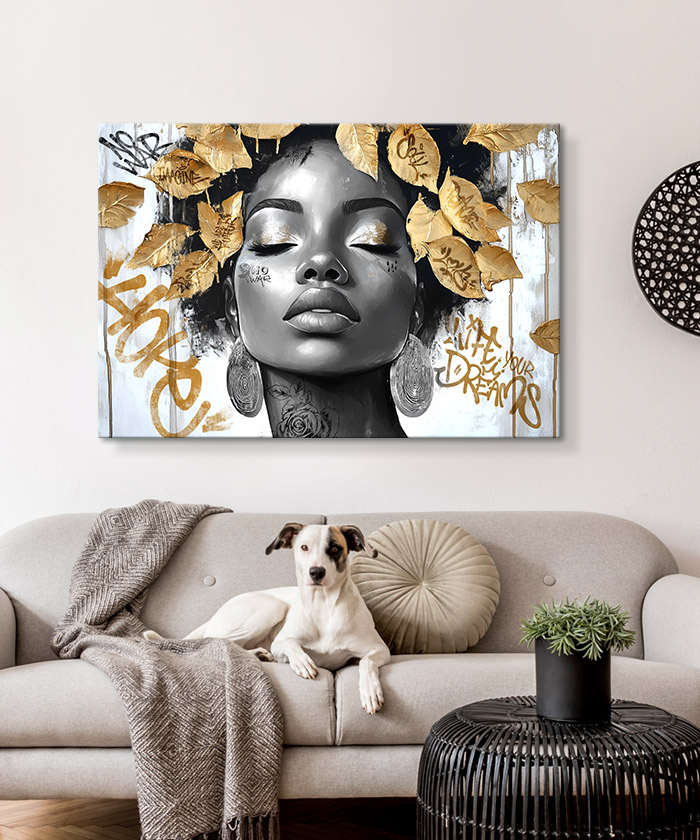 Chez Tableau Déco, nous réalisons tous les visuels de nos tableaux décoratifs. Notre métier, c’est aussi la création artistique. Ainsi, vous ne retrouverez nos tableaux nulle part ailleurs. Nous fabriquons ce tableau déco portrait femme africaine feuille d’or street art en France, dans notre atelier de région parisienne.