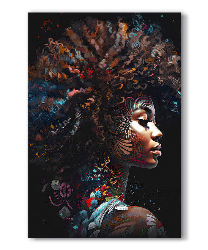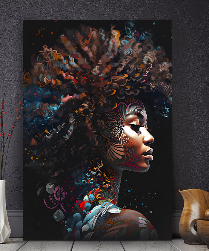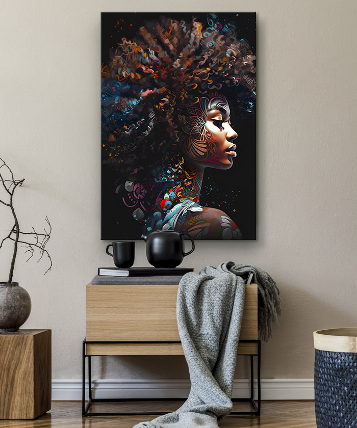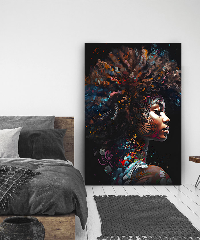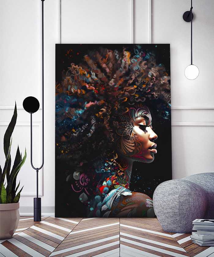 Nous vous présentons le tableau déco portrait femme afro africaine moderne pop art. Si vous aimez la peinture, vous devriez aimer ce tableau déco de femme africaine autant que nous. En vous proposant ce tableau décoratif, nous souhaitons apporter un zeste d’originalité à votre intérieur. Cette toile propose une touche à la fois ethnique et chic.