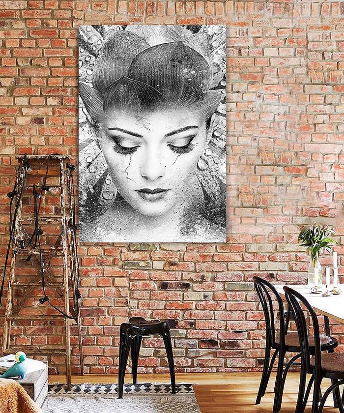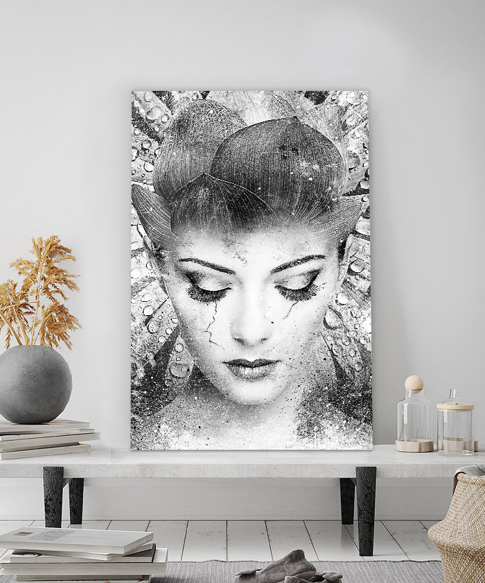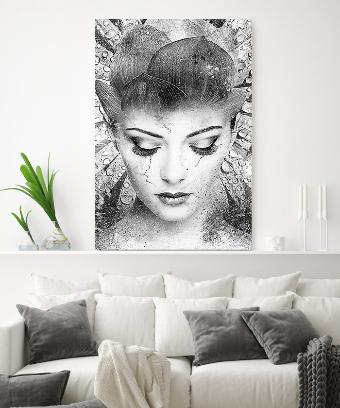 Chez Tableau Déco, nous réalisons tous les visuels de nos tableaux décoratifs. Notre métier, c’est aussi la création artistique. Ainsi, vous ne retrouverez nos tableaux nulle part ailleurs. Nous fabriquons ce tableau déco portrait femme fleur de lotus – noir et blanc en France, dans notre atelier de région parisienne.