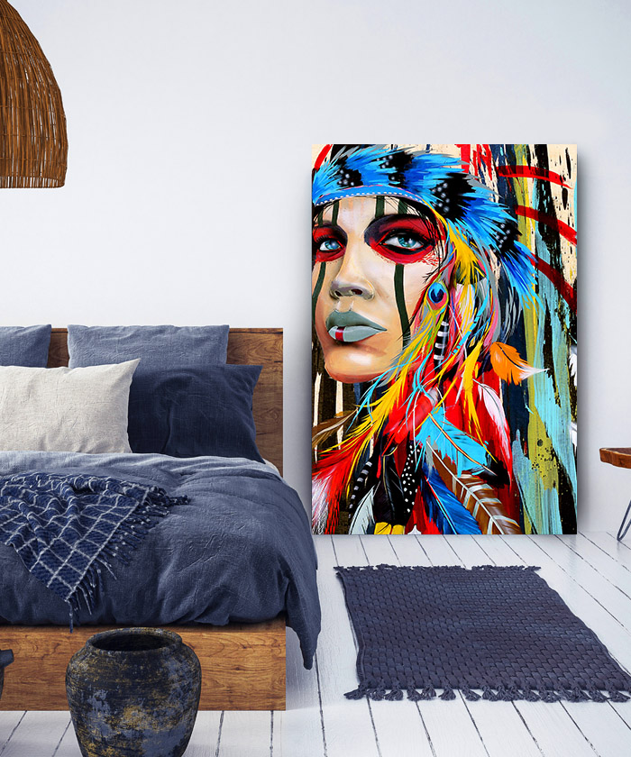 Chez Tableau Déco, nous réalisons tous les visuels de nos tableaux décoratifs. Notre métier, c’est aussi la création artistique. Ainsi, vous ne retrouverez nos tableaux nulle part ailleurs. Nous fabriquons ce tableau déco portrait femme indienne peinture pop art en France, dans notre atelier de région parisienne.
