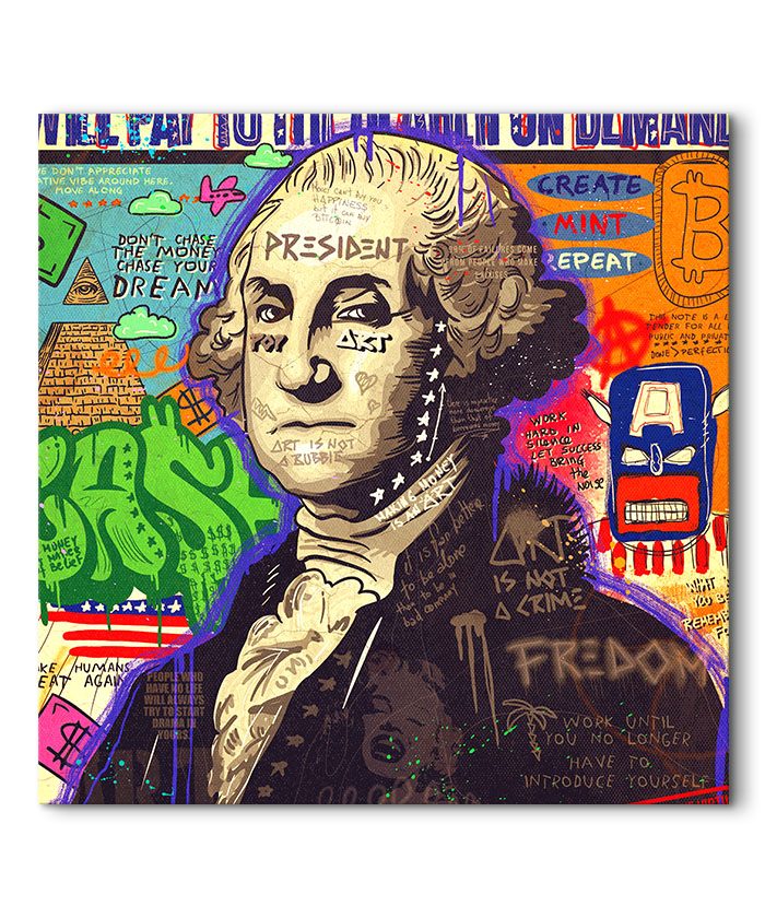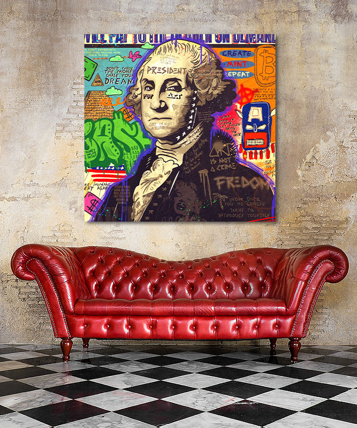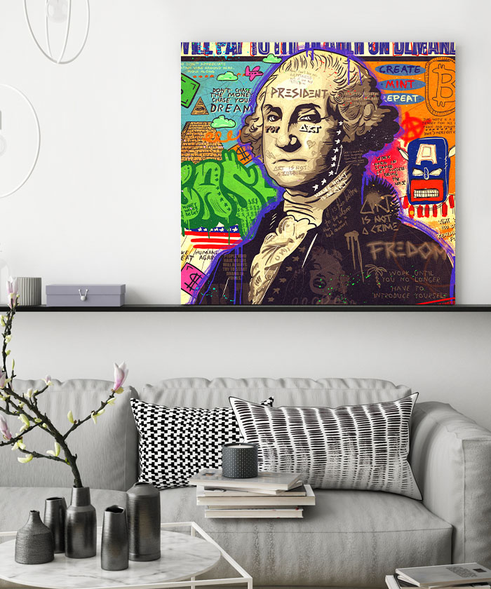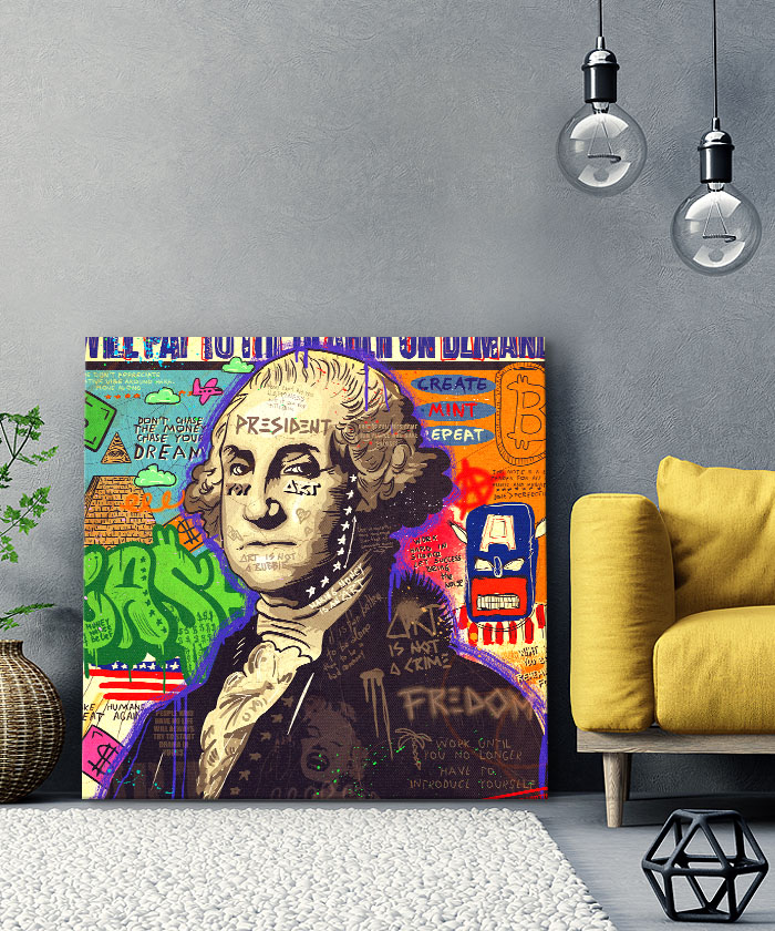 Nous vous présentons le tableau déco Président George Washington Comics Pop Art. Si vous aimez la décoration pop-art, vous devriez aimer ce tableau déco de George Washington autant que nous. En vous proposant ce tableau décoratif, nous souhaitons apporter un zeste d’originalité à votre intérieur. Cette toile propose une touche à la fois moderne et colorée.