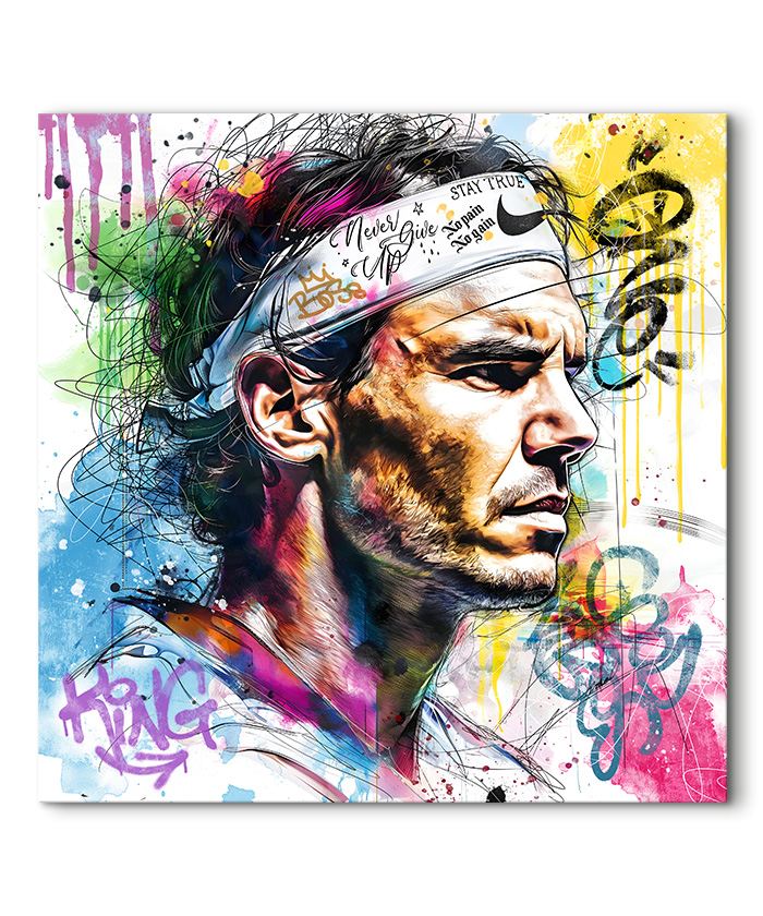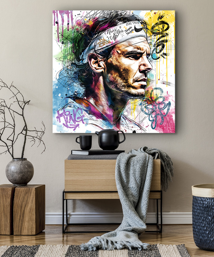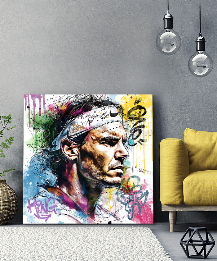 Nous vous présentons le tableau déco Rafael Nadal Joueur de Tennis pop-art aquarelle. Si vous aimez le tennis, vous devriez aimer ce tableau de Rafael Nadal autant que nous. En vous proposant ce tableau décoratif, nous souhaitons apporter un zeste d’originalité à votre intérieur. Cette toile propose une touche à la fois fun et moderne.