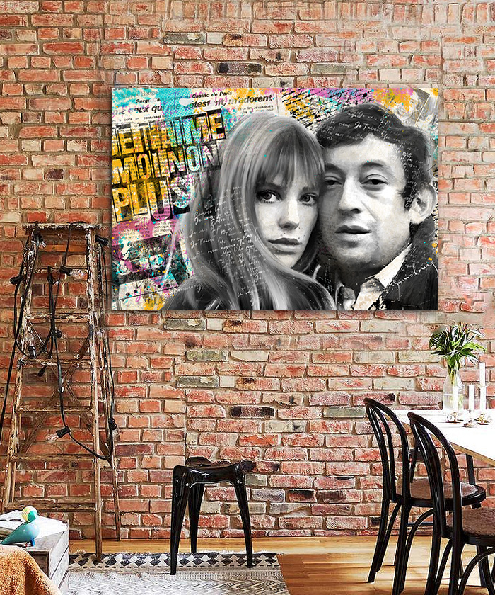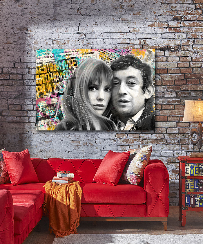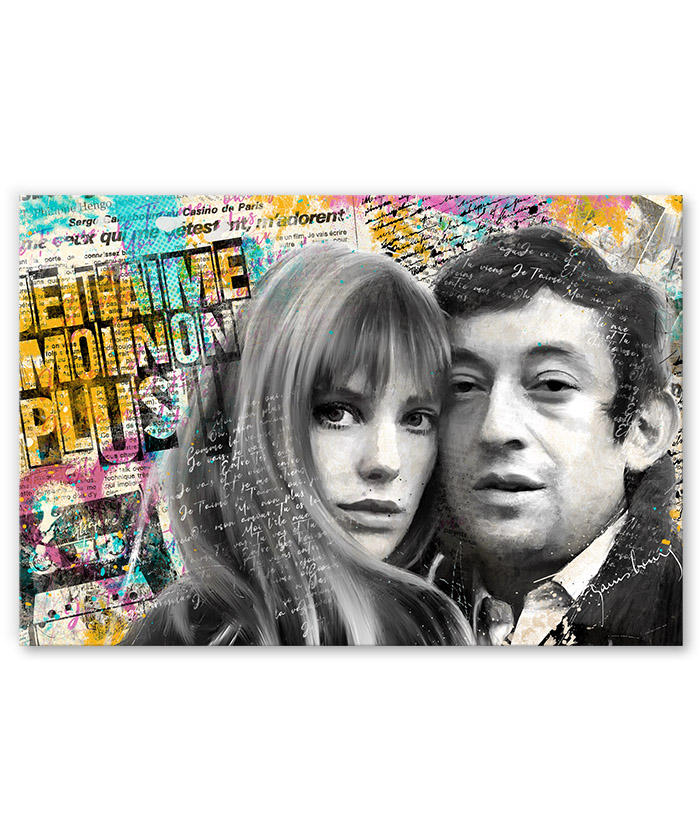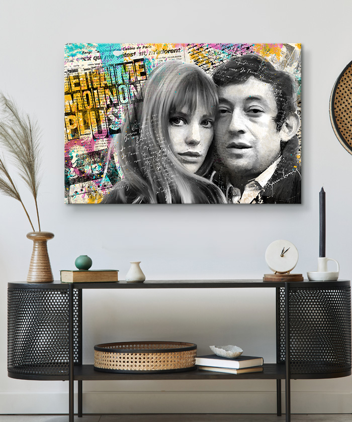 Nous vous présentons le tableau déco Serge Gainsbourg et Jane Birkin Pop Art. Si vous aimez l’art urbain, vous devriez aimer ce tableau déco du couple Gainsbourg et Birkin autant que nous. En vous proposant ce tableau décoratif, nous souhaitons apporter un zeste d’originalité à votre intérieur. Cette toile propose une touche à la fois urbaine et design.