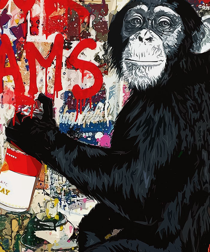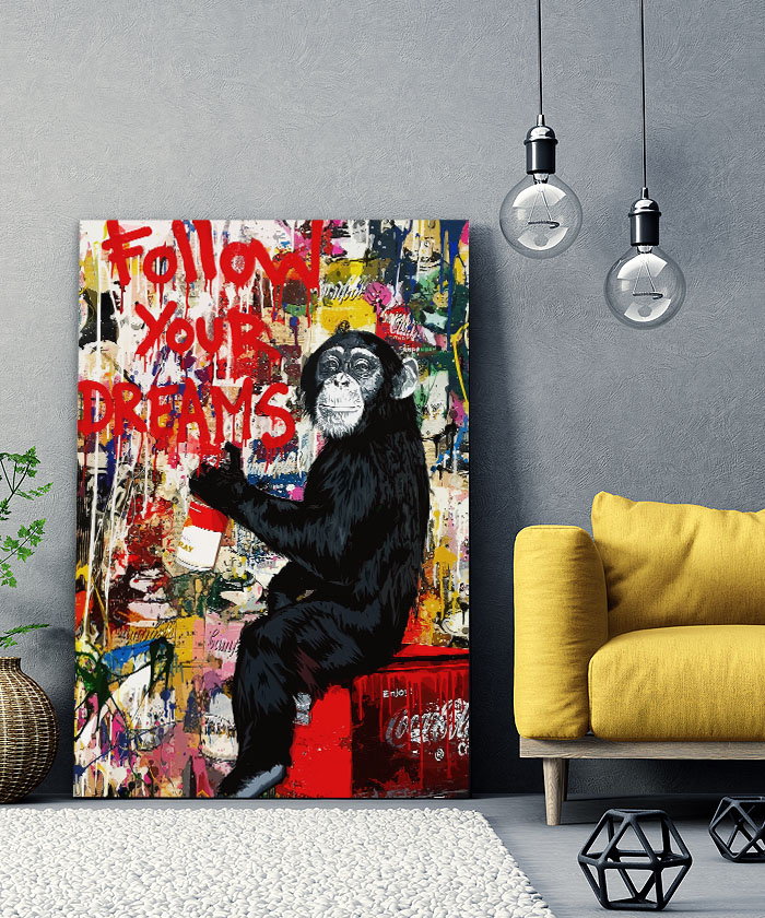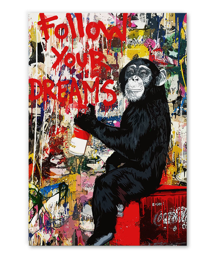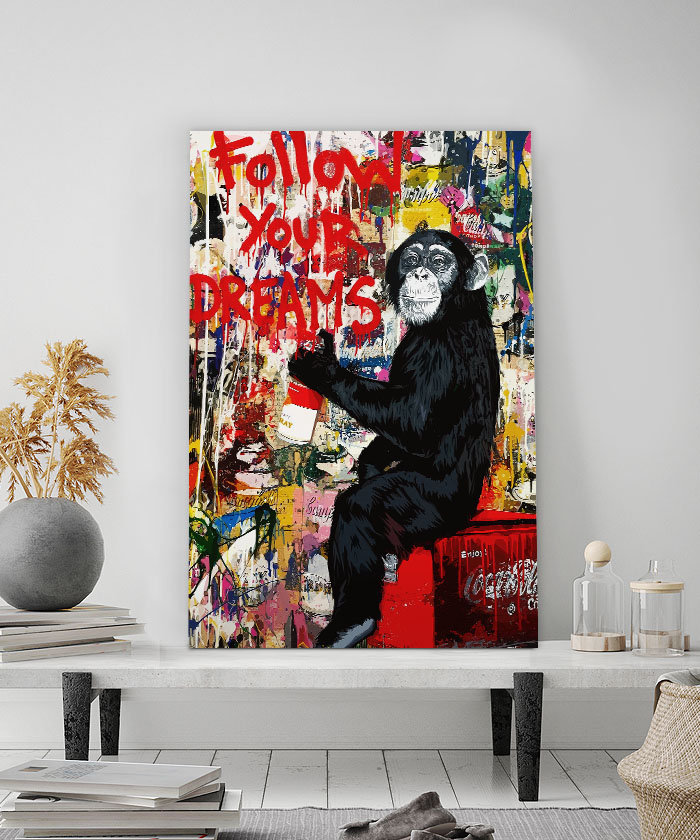 Nous vous présentons le tableau déco singe street art – Suivre ses rêves. Si vous faites partie de ceux qui sont fans de cet animal, vous devriez aimer ce tableau déco de singe autant que nous. En vous proposant ce tableau décoratif, nous souhaitons apporter un zeste d’originalité à votre intérieur. Cette toile propose une touche à la fois urbain et street-art.