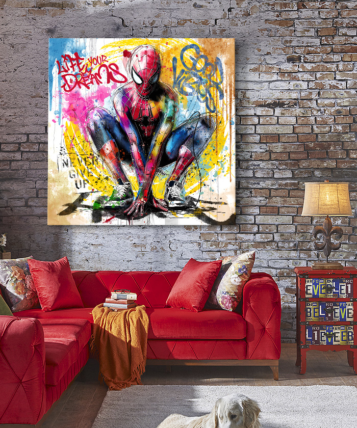Chez Tableau Déco, nous réalisons tous les visuels de nos tableaux décoratifs. Notre métier, c’est aussi la création artistique. Ainsi, vous ne retrouverez nos tableaux nulle part ailleurs. Nous fabriquons ce tableau déco Spiderman pop art aquarelle graffiti en France, dans notre atelier de région parisienne.