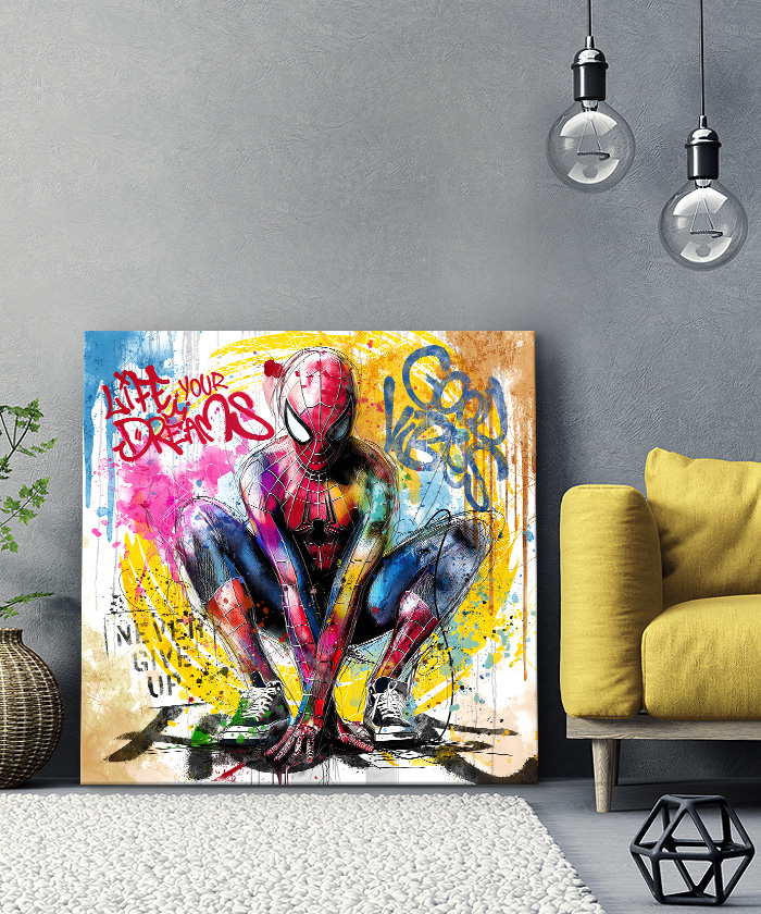 Nous vous présentons le tableau déco Spiderman pop art aquarelle graffiti.Si vous aimez ce super-héros, vous devriez aimer ce tableau déco de Spiderman autant que nous. En vous proposant ce tableau décoratif, nous souhaitons apporter un zeste d’originalité à votre intérieur. Cette toile propose une touche à la fois urbaine et colorée.