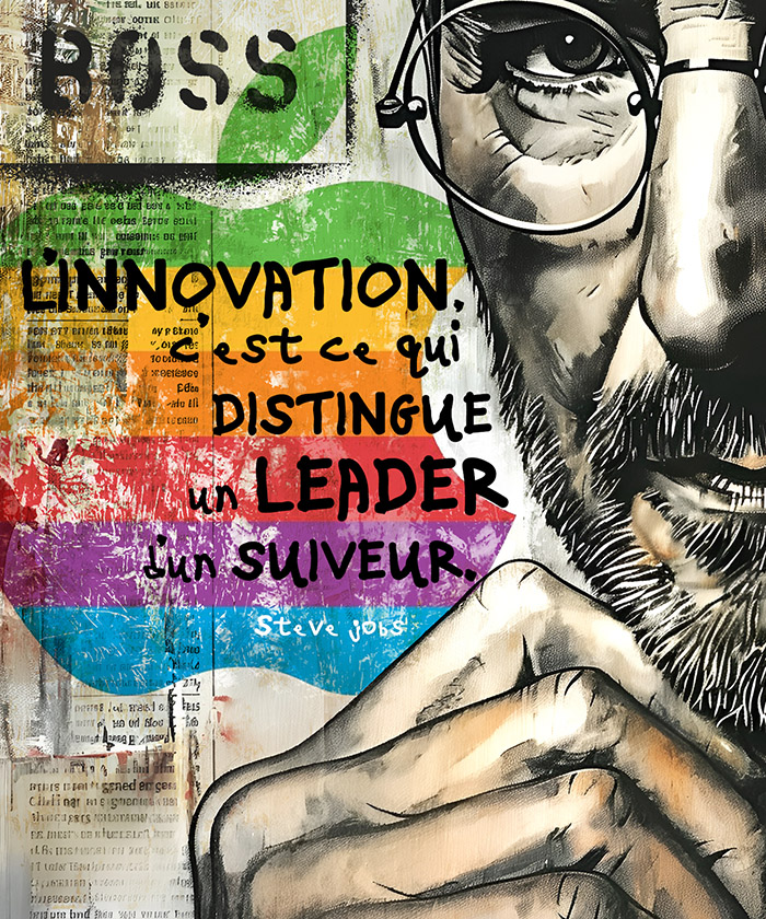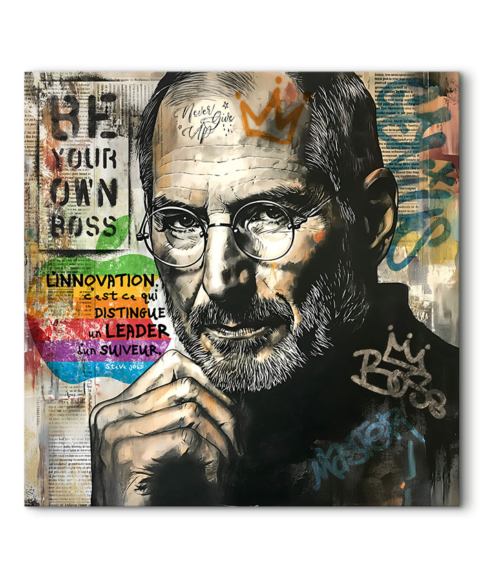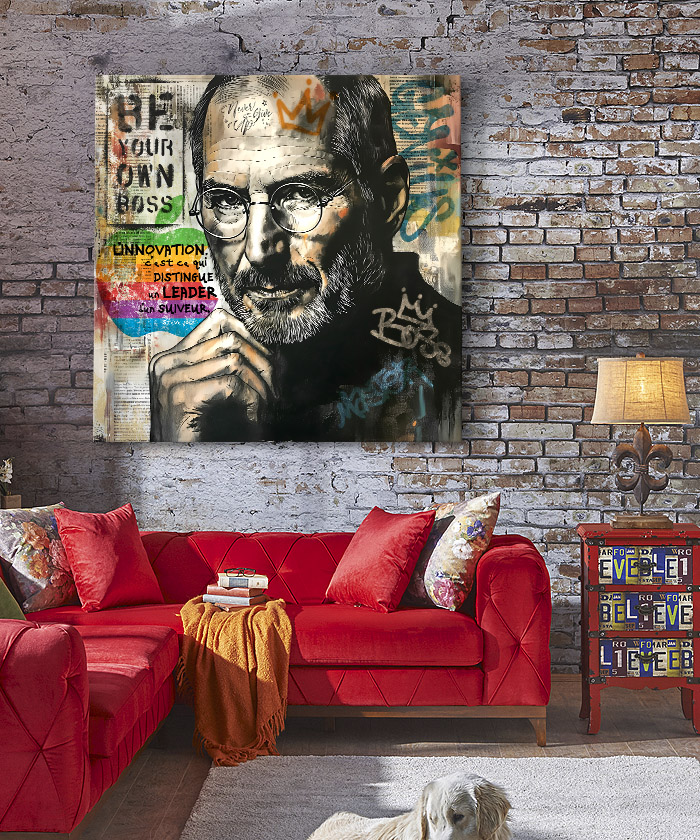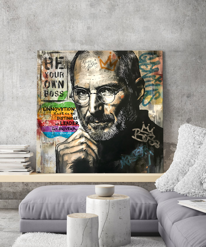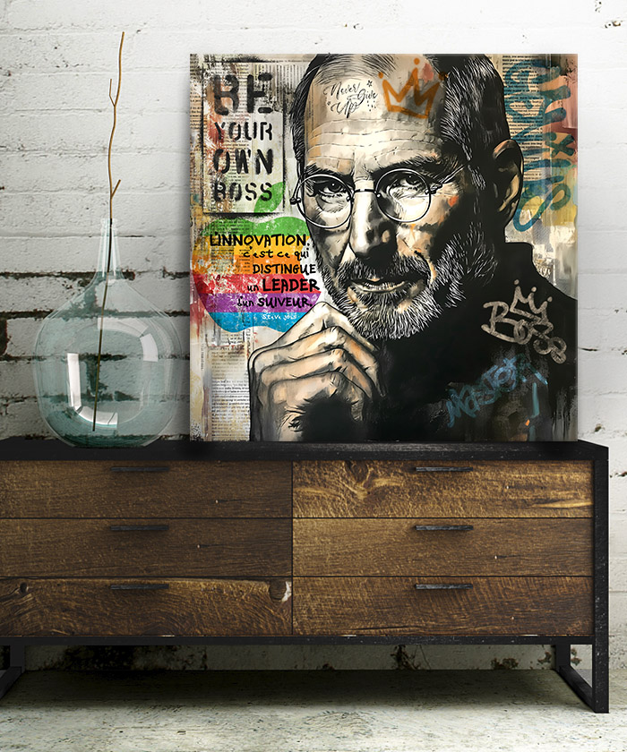 Nous vous présentons le tableau déco Steve Jobs street-art. Si vous aimez cette célébrité, vous devriez aimer ce tableau street-art autant que nous. En vous proposant ce tableau décoratif, nous souhaitons apporter un zeste d’originalité à votre intérieur. Cette toile propose une touche à la fois urbaine et design.