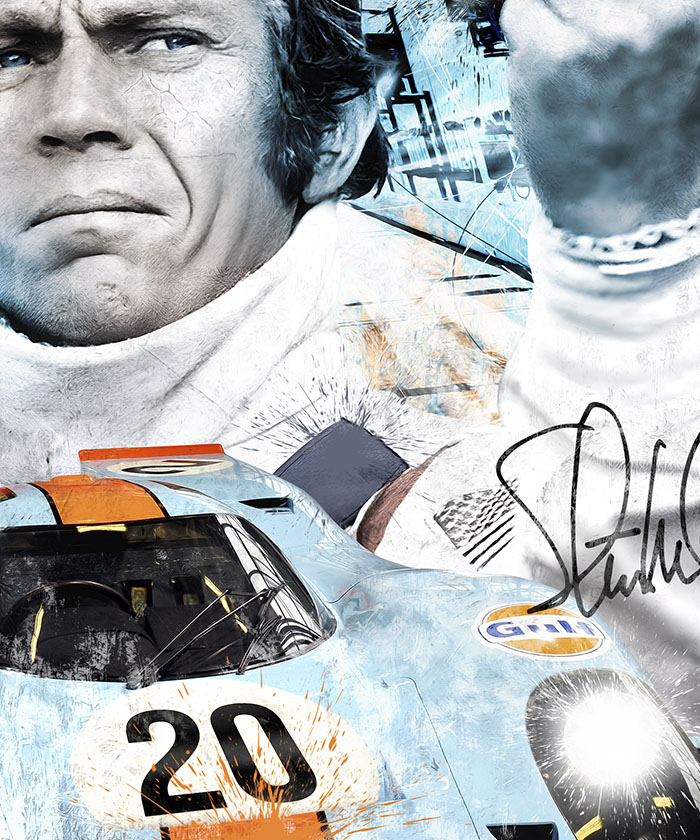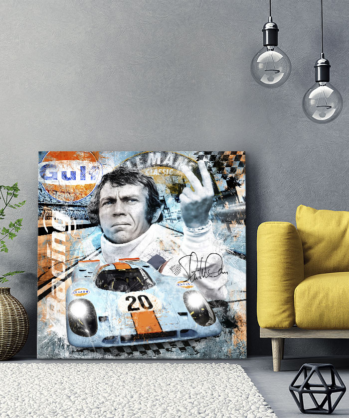 Chez Tableau Déco, nous réalisons tous les visuels de nos tableaux décoratifs. Notre métier, c’est aussi la création artistique. Ainsi, vous ne retrouverez nos tableaux nulle part ailleurs. Nous fabriquons ce tableau déco Steve McQueen La Mans Gulf pop art en France, dans notre atelier de région parisienne.