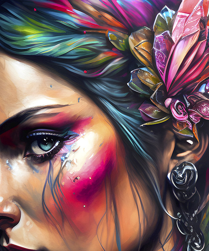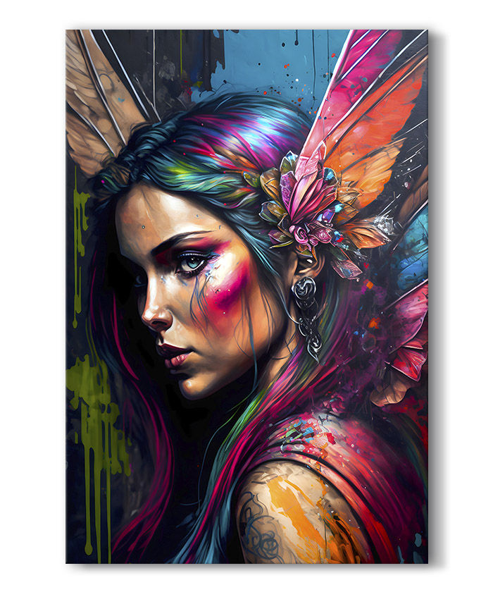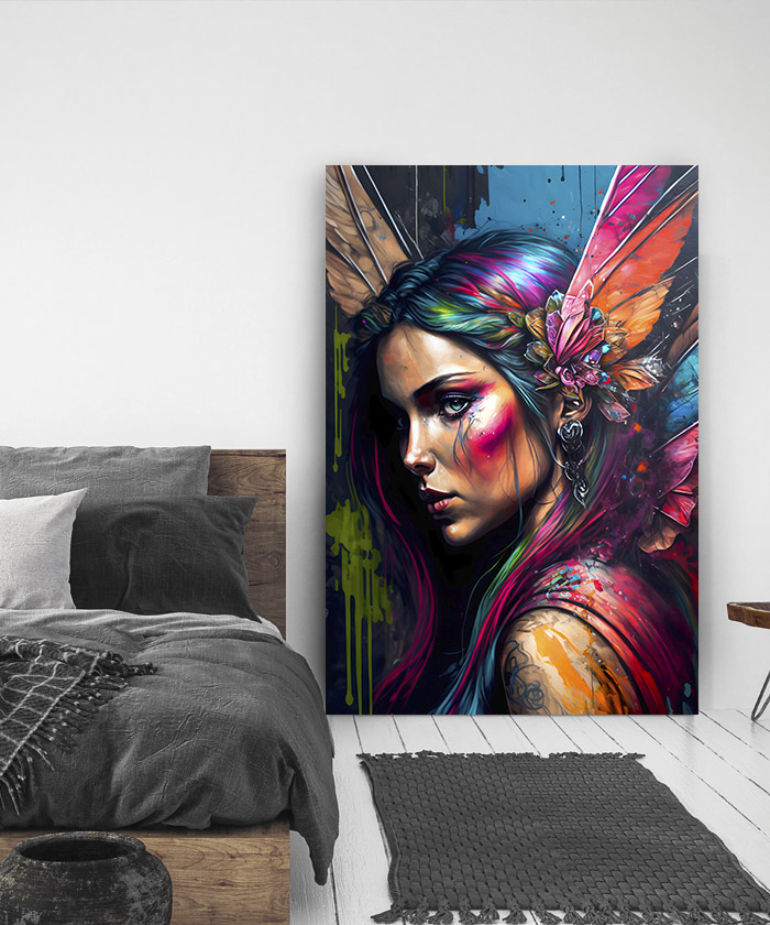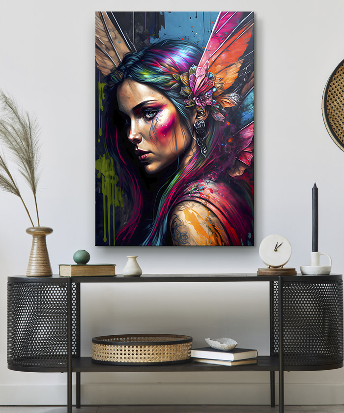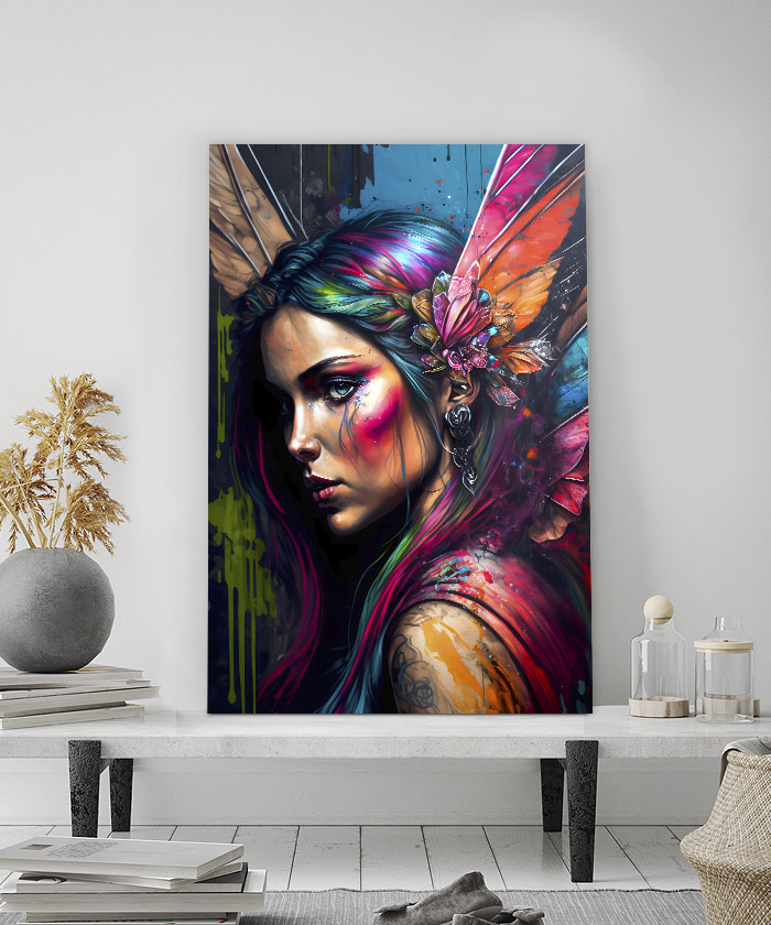 Nous vous présentons le tableau déco street art portrait femme fée. Si vous aimez l’art urbain, vous devriez aimer ce tableau déco de femme fée autant que nous. En vous proposant ce tableau décoratif, nous souhaitons apporter un zeste d’originalité à votre intérieur. Cette toile propose une touche à la fois urbaine et colorée.