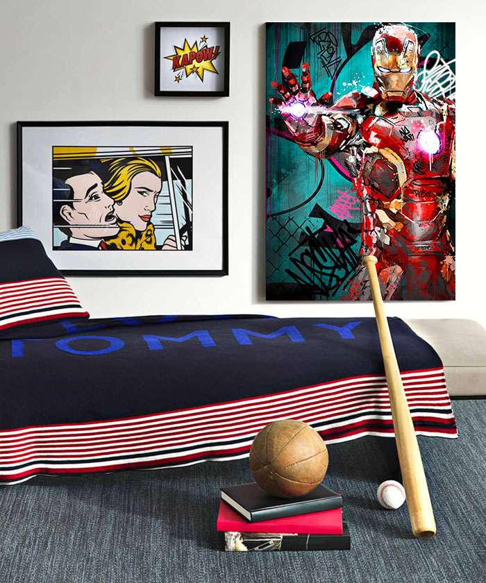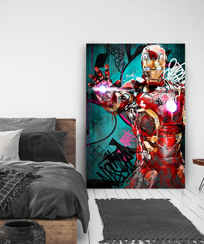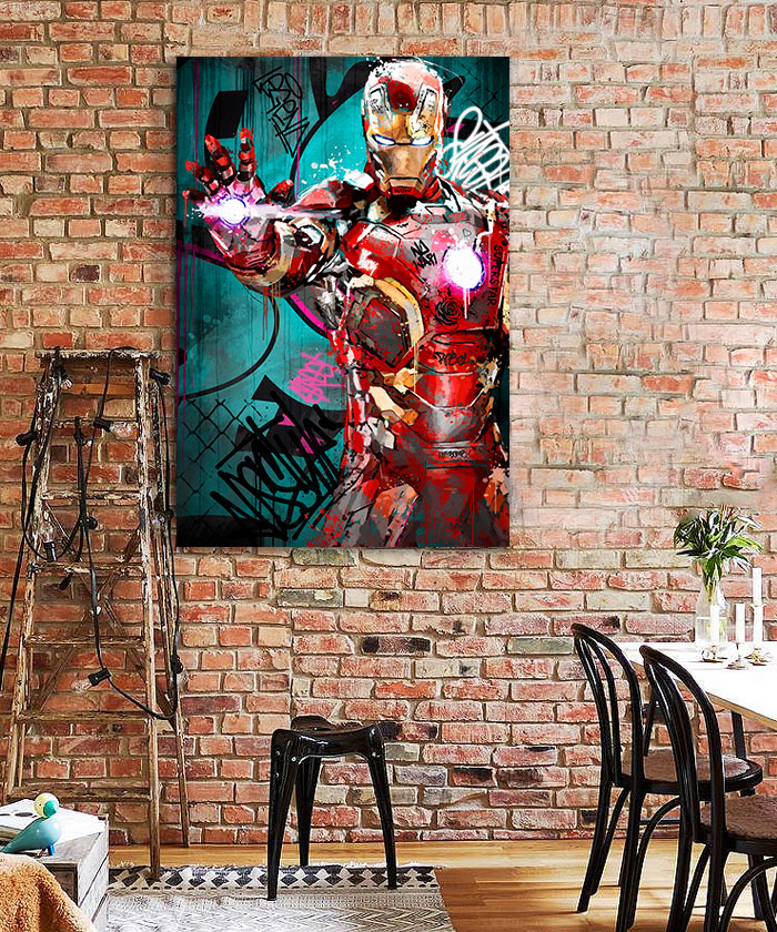 Chez Tableau Déco, nous réalisons tous les visuels de nos tableaux décoratifs. Notre métier, c’est aussi la création artistique. Ainsi, vous ne retrouverez nos tableaux nulle part ailleurs. Nous fabriquons ce tableau déco Iron Man Marvel peinture street art graffiti en France, dans notre atelier de région parisienne.