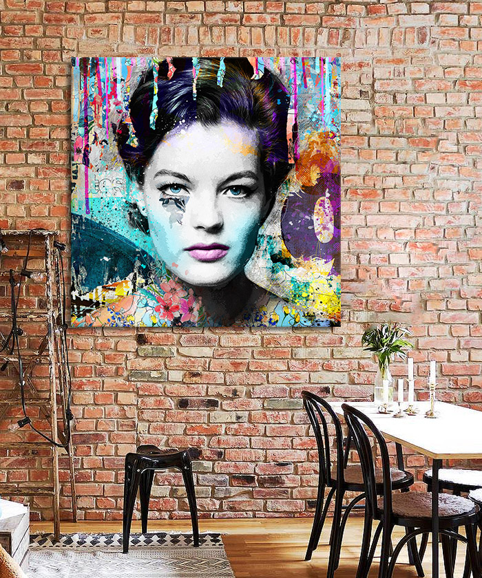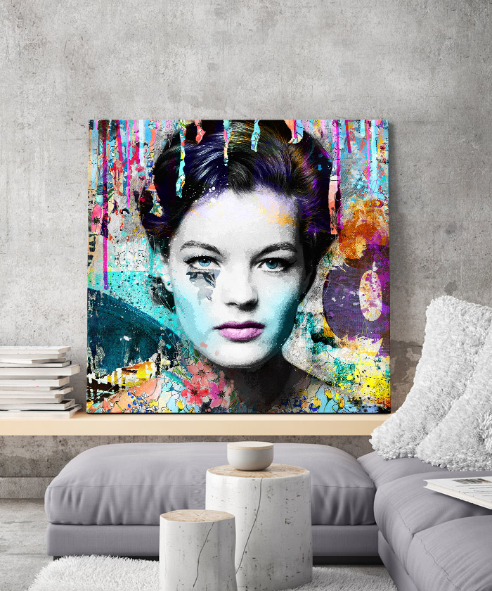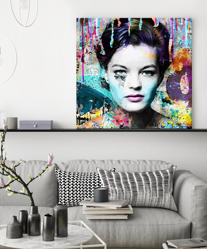 Nous vous présentons le tableau déco pop art Romy Schneider. Si vous aimez cette célébrité, vous devriez aimer ce tableau déco de Romy Schneider autant que nous. En vous proposant ce tableau décoratif, nous souhaitons apporter un zeste d’originalité à votre intérieur. Cette toile propose une touche à la fois glamour et contemporaine.