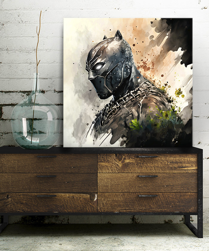 Chez Tableau Déco, nous réalisons tous les visuels de nos tableaux décoratifs. Notre métier, c’est aussi la création artistique. Ainsi, vous ne retrouverez nos tableaux nulle part ailleurs. Nous fabriquons ce tableau déco portrait Black Panther aquarelle pastel en France, dans notre atelier de région parisienne.