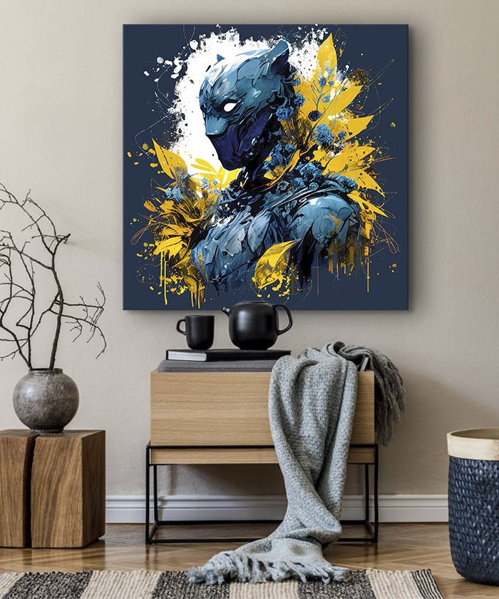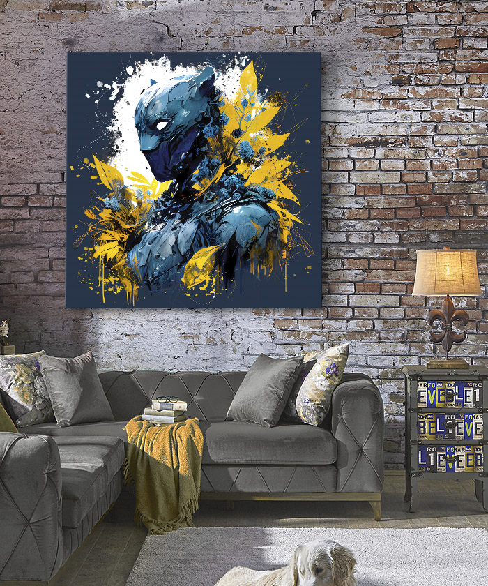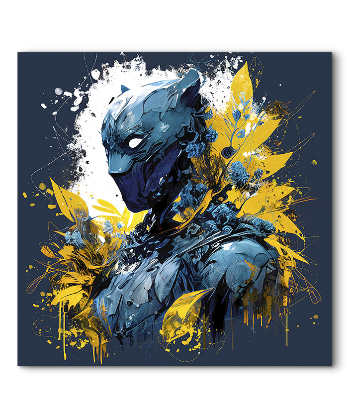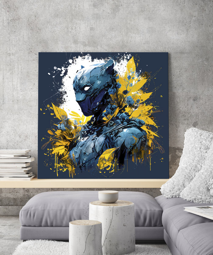 Nous vous présentons le tableau déco portrait Black Panther orné de feuilles. Si vous aimez ce super-héros, vous devriez aimer ce tableau déco de Black Panther autant que nous. En vous proposant ce tableau décoratif, nous souhaitons apporter un zeste d’originalité à votre intérieur. Cette toile propose une touche à la fois moderne et design.