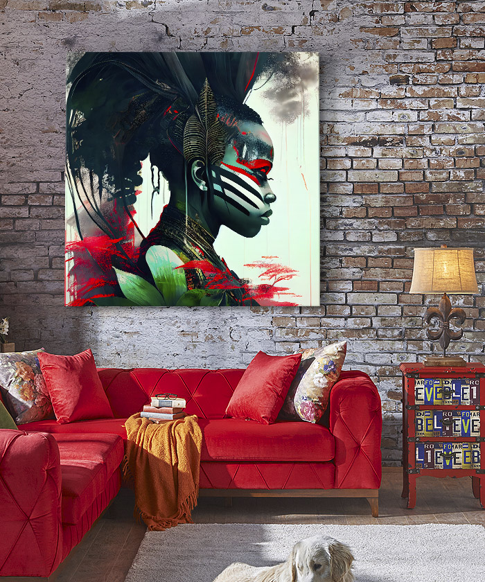 Chez Tableau Déco, nous réalisons tous les visuels de nos tableaux décoratifs. Notre métier, c’est aussi la création artistique. Ainsi, vous ne retrouverez nos tableaux nulle part ailleurs. Nous fabriquons ce tableau déco portrait femme africaine fleurs sauvages en France, dans notre atelier de région parisienne.