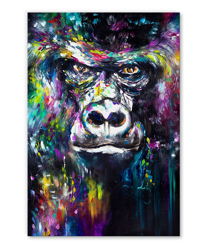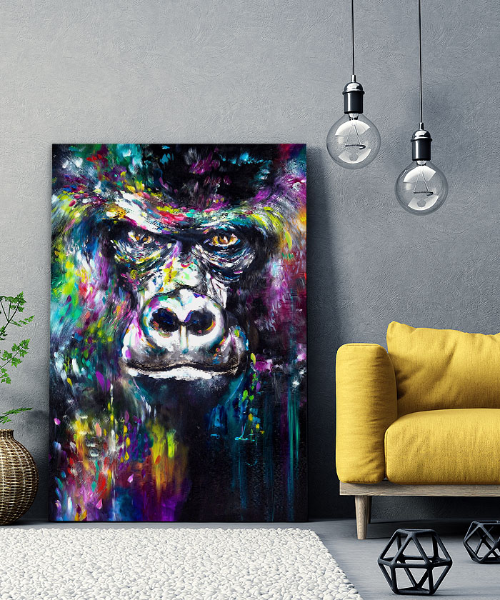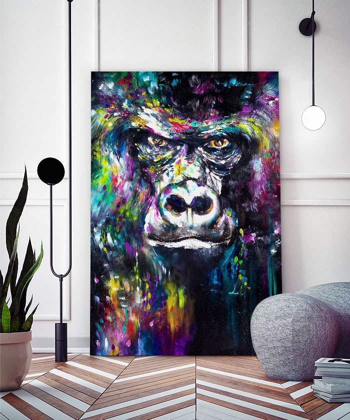 Nous vous présentons le tableau déco portrait gorille peinture pop art. Si vous faites partie de ceux qui sont fans de cet animal, vous devriez aimer ce tableau déco de gorille autant que nous. En vous proposant ce tableau décoratif, nous souhaitons apporter un zeste d’originalité à votre intérieur. Cette toile propose une touche à la fois animale et pop-art.