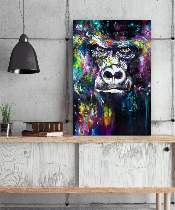 Chez Tableau Déco, nous réalisons tous les visuels de nos tableaux décoratifs. Notre métier, c’est aussi la création artistique. Ainsi, vous ne retrouverez nos tableaux nulle part ailleurs. Nous fabriquons ce tableau déco portrait gorille peinture pop art en France, dans notre atelier de région parisienne.