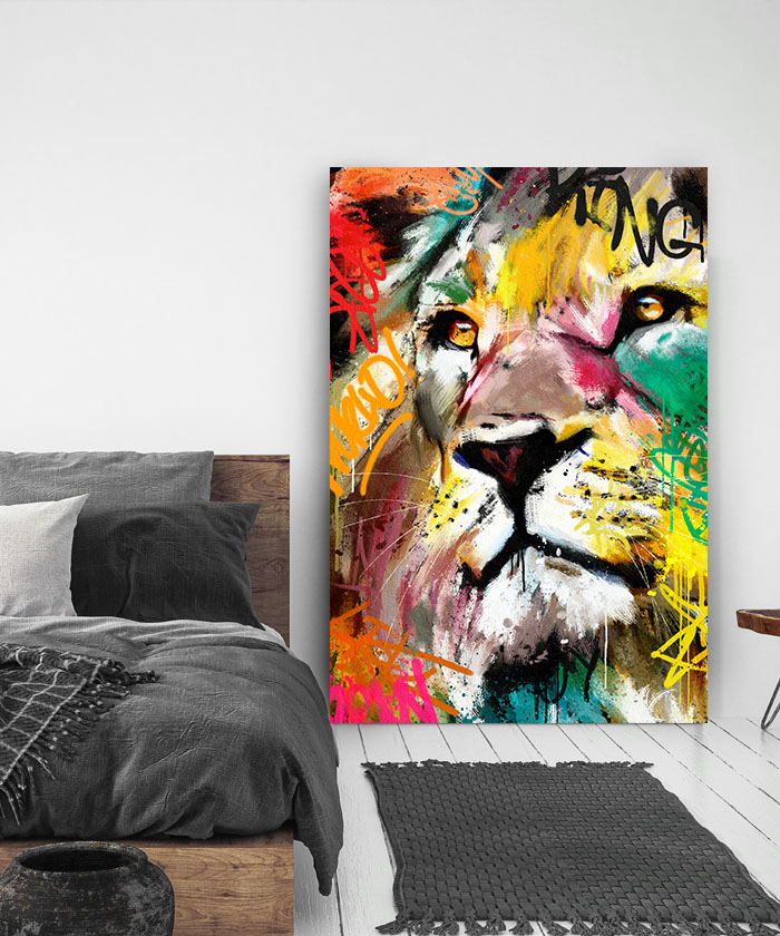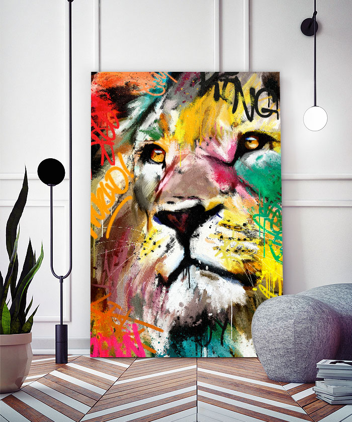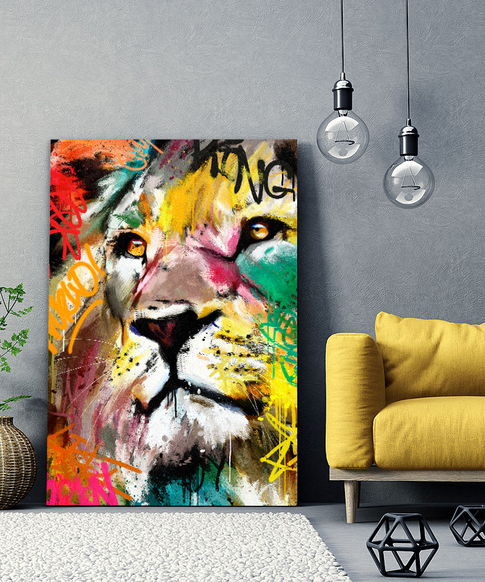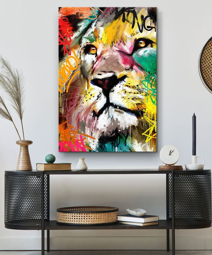 Nous vous présentons le tableau déco portrait lion peinture street art. Si vous faites partie de ceux qui sont fans de cet animal, vous devriez aimer ce tableau déco de lion autant que nous. En vous proposant ce tableau décoratif, nous souhaitons apporter un zeste d’originalité à votre intérieur. Cette toile propose une touche à la fois moderne et street-art.