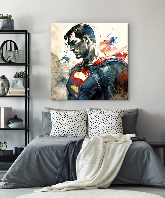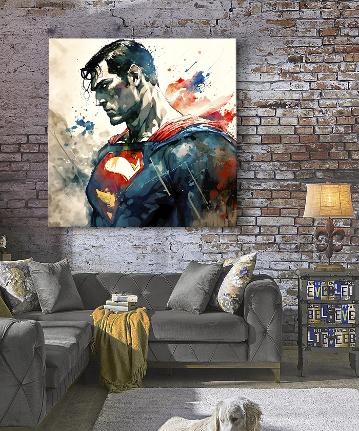 Chez Tableau Déco, nous réalisons tous les visuels de nos tableaux décoratifs. Notre métier, c’est aussi la création artistique. Ainsi, vous ne retrouverez nos tableaux nulle part ailleurs. Nous fabriquons ce tableau déco portrait Superman aquarelle pastel en France, dans notre atelier de région parisienne.