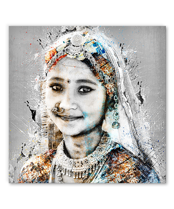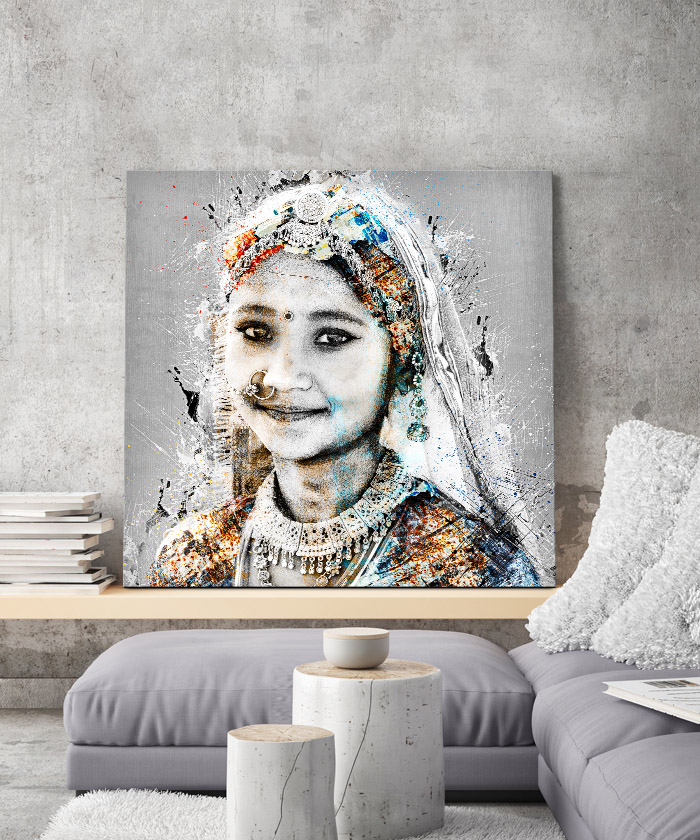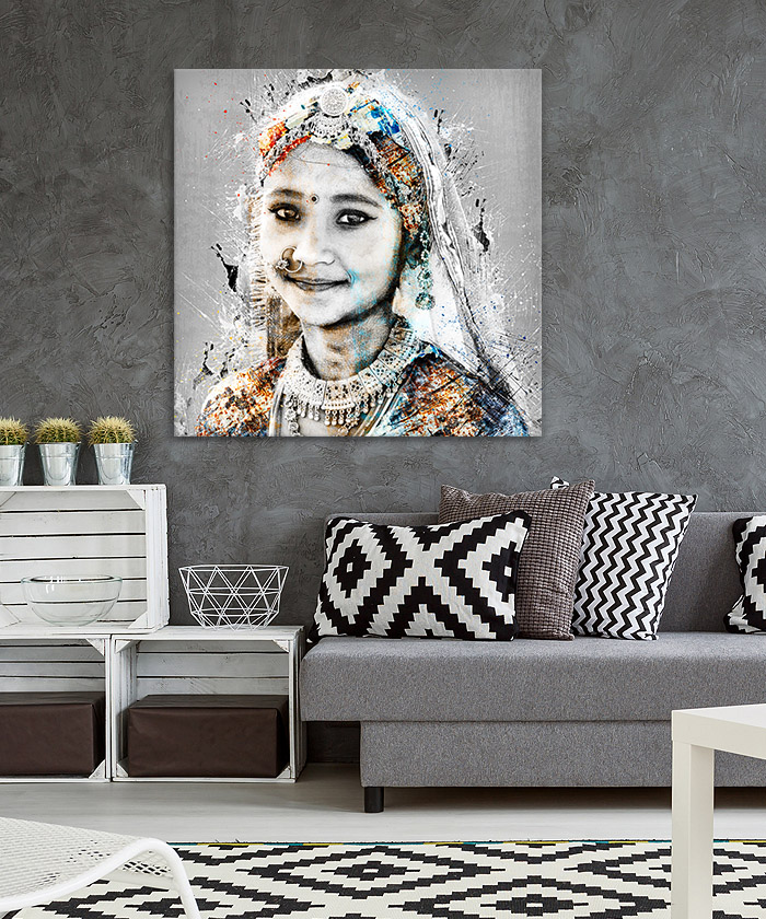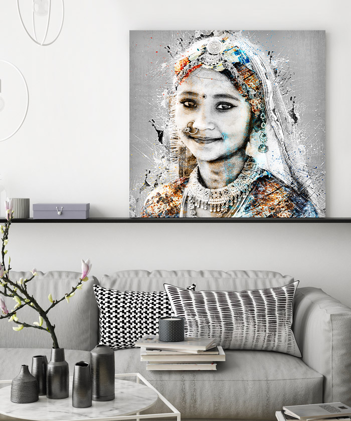 Nous vous présentons le tableau déco portrait traditionnel fille indienne. Si vous appréciez les portraits ethniques, vous devriez aimer ce tableau déco de jeune fille indienne autant que nous. En vous proposant ce tableau décoratif, nous souhaitons apporter un zeste d’originalité à votre intérieur. Cette toile propose une touche à la fois ethnique et chaleureuse.