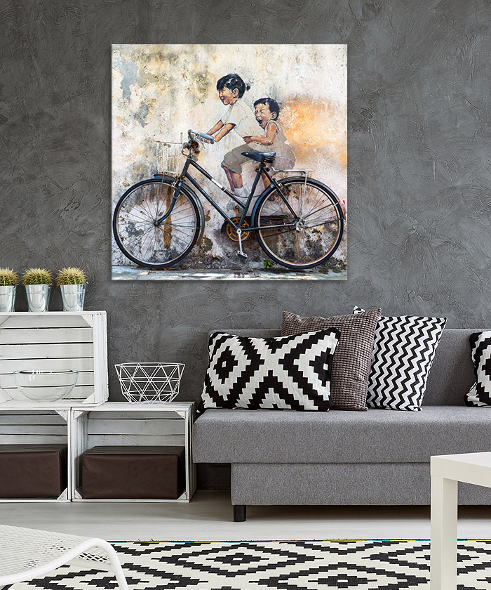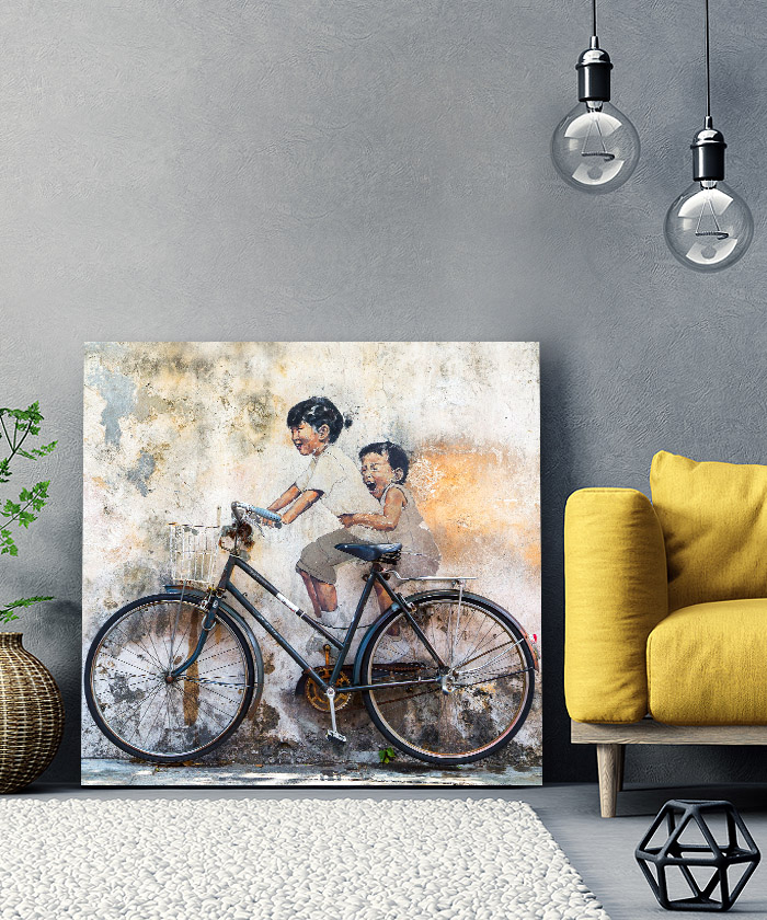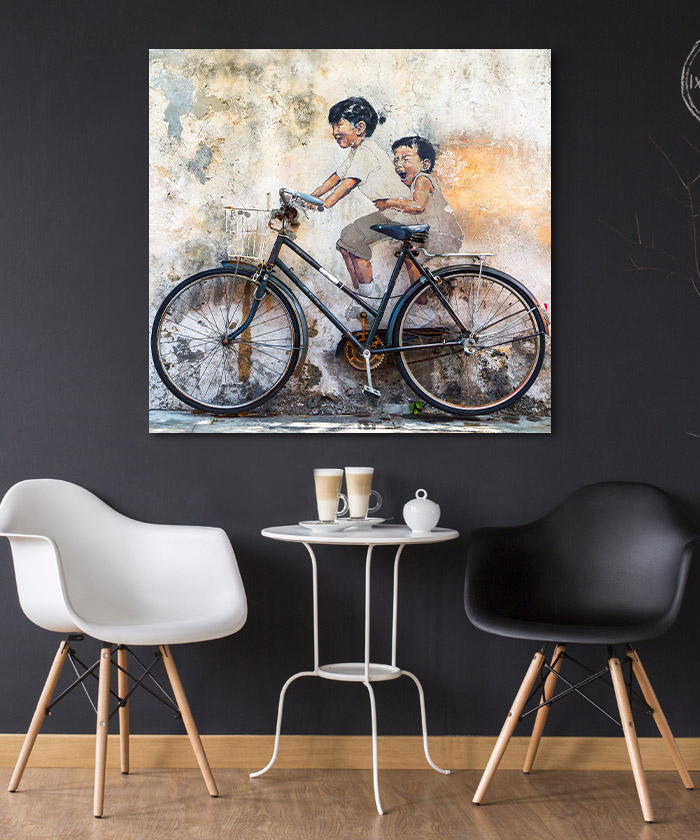 Chez Tableau Déco, nous réalisons tous les visuels de nos tableaux décoratifs. Notre métier, c’est aussi la création artistique. Ainsi, vous ne retrouverez nos tableaux nulle part ailleurs. Nous fabriquons ce tableau déco street art 2 enfants sur un vélo en France, dans notre atelier de région parisienne.