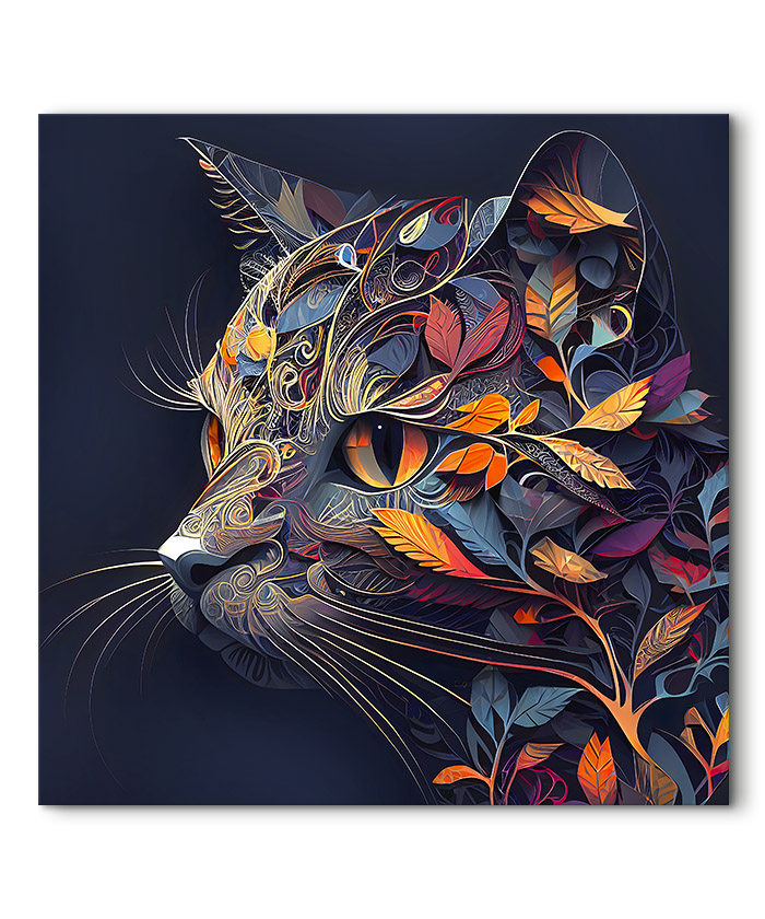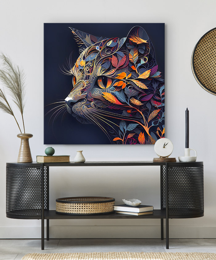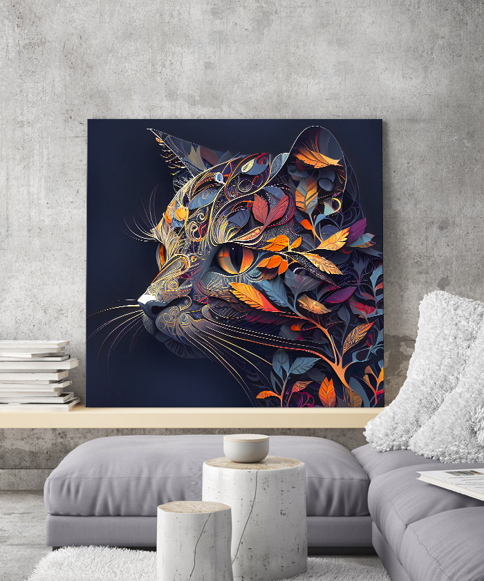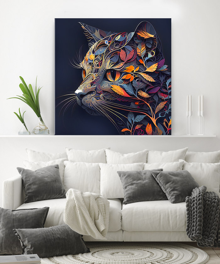 Chez Tableau Déco, nous réalisons tous les visuels de nos tableaux décoratifs. Notre métier, c’est aussi la création artistique. Ainsi, vous ne retrouverez nos tableaux nulle part ailleurs. Nous fabriquons ce tableau déco tête de chat en feuilles en France, dans notre atelier de région parisienne.