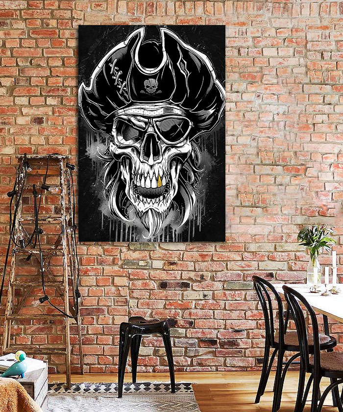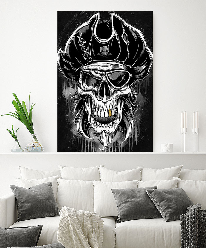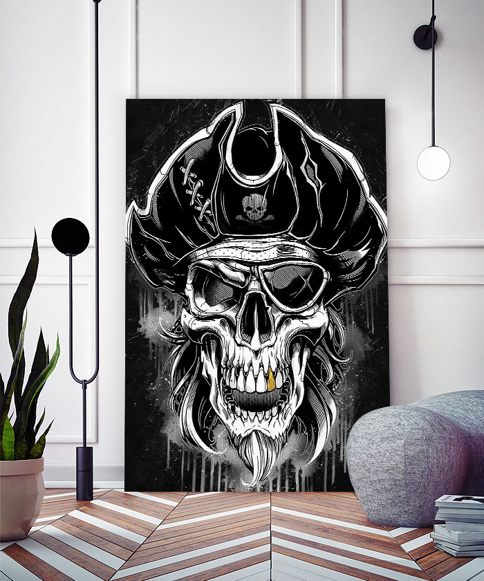 Nous vous présentons le tableau déco tête de mort pirate. Si vous faites partie de ceux qui sont fans de pirates, vous devriez aimer ce tableau déco de tête de mort autant que nous. En vous proposant ce tableau décoratif, nous souhaitons apporter un zeste d’originalité à votre intérieur. Cette toile propose une touche à la fois graphique et sobre.